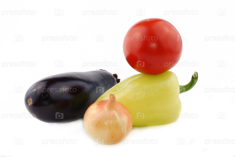 Зеленый перец, лук, баклажан и помидор на белом фоне