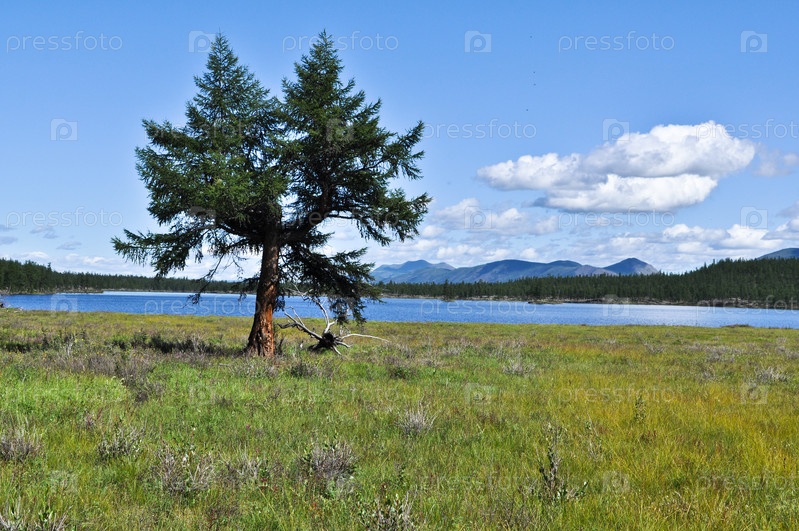 Одинокая лиственница на берегу озера