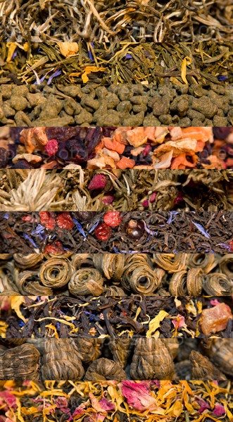 Коллаж из различных сортов черного и зеленого чая