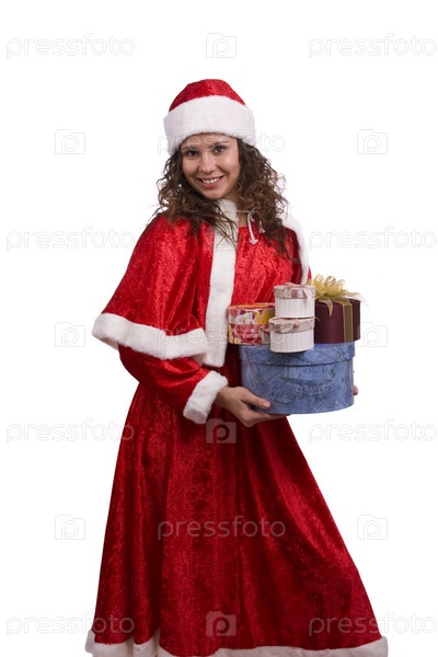 Женщина Санта, одетая в красный рождественский костюм, держит подарки