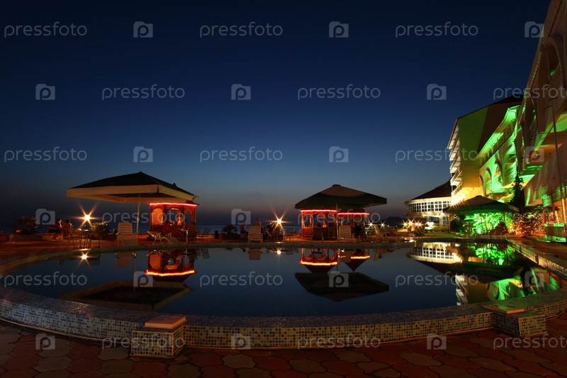 Гостиница, кафе и бассейн ночью
