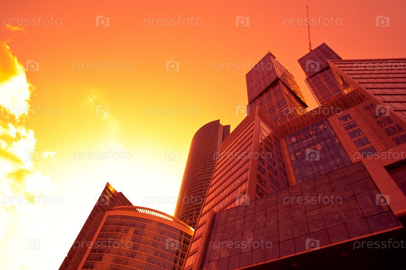 Вид на закат солнца на новый бизнес-центр в оранжевом цвете