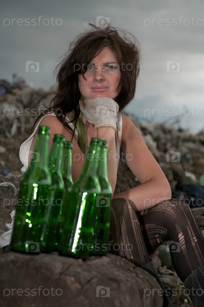 Бездомная девушка с бутылками на свалке