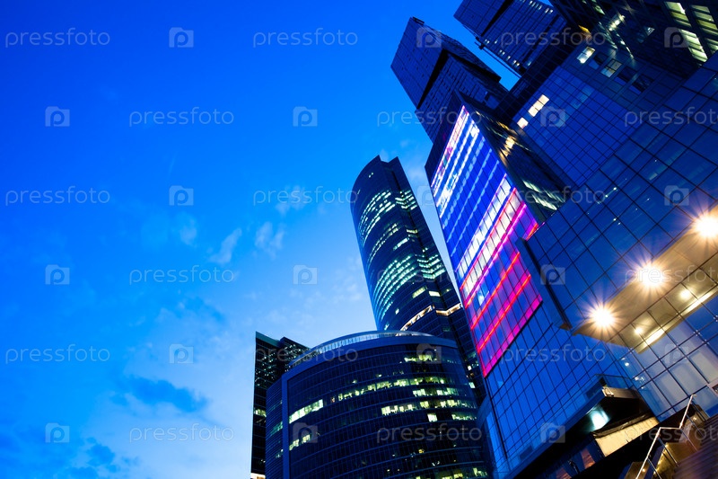 Вид на закат солнца на новый бизнес-центр в оранжевом цвете