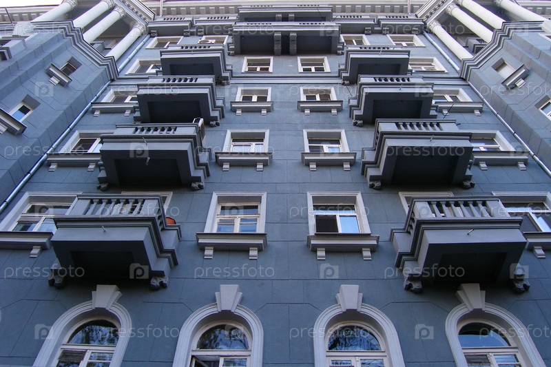 Фасад серого здания с балконами снизу