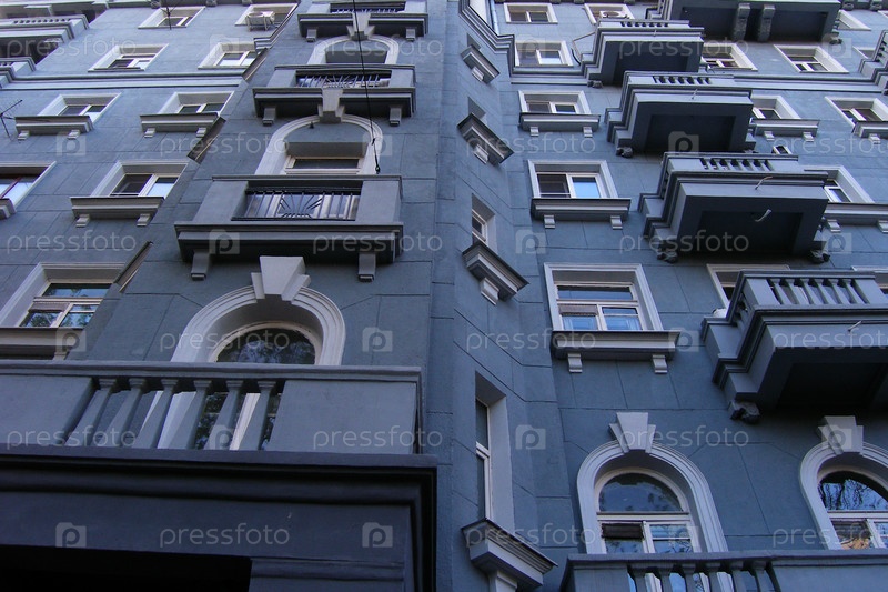 Фасад серого здания с балконами крупным планом