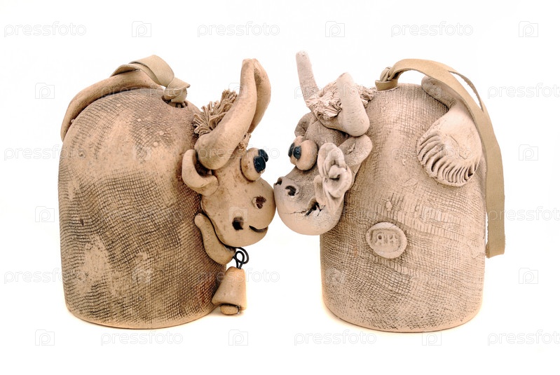 Глиняные фигурки коровы на белом фоне