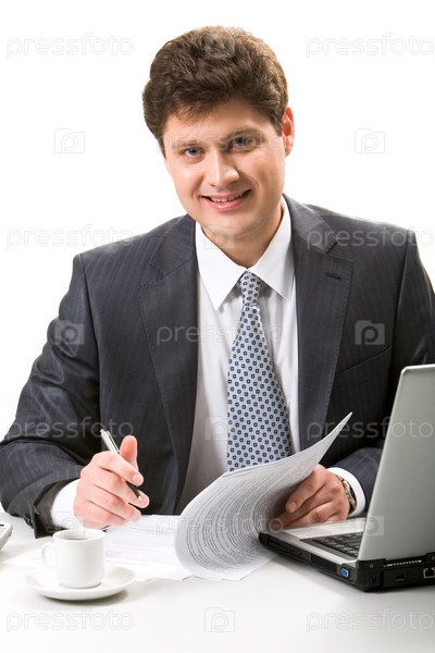 Портрет уверенного бизнесмена, сидящего на рабочем месте и оглядывающегося в сторону
