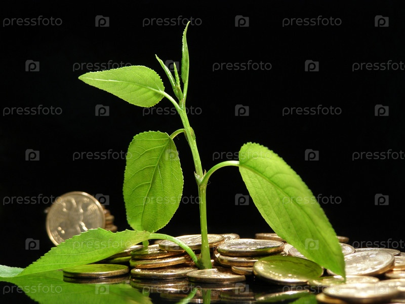 Зеленый росток в монетах на черном фоне