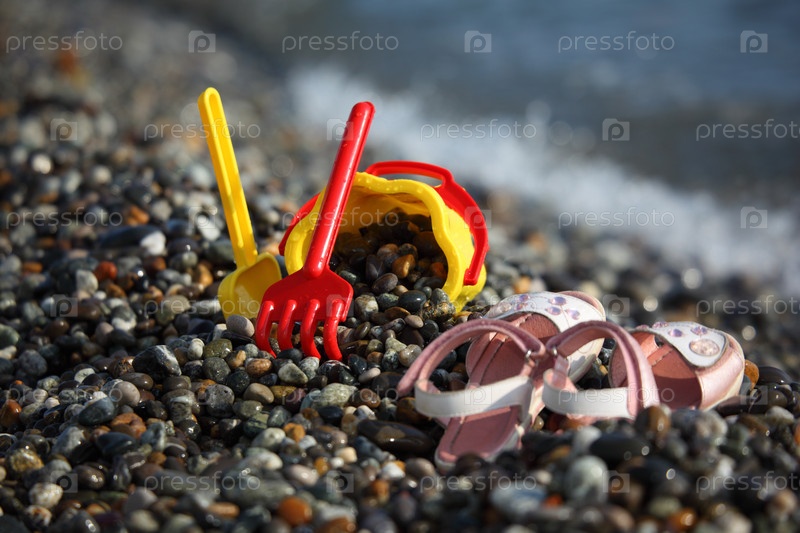 Детские игрушки и сандалии на берегу моря