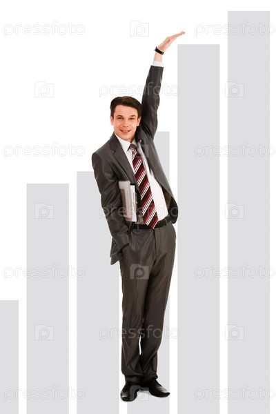 Креативное фото счастливого бизнесмена, показывающее рост на графике