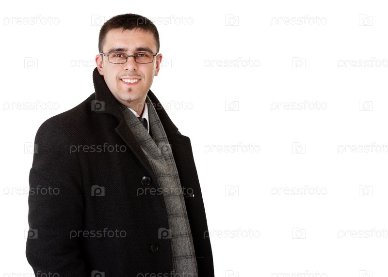 Улыбающийся бизнесмен в осеннем пальто на белом фоне