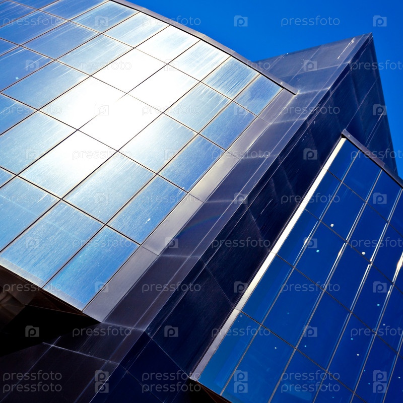 Современное синее офисное здание с центральной черной конструкцией