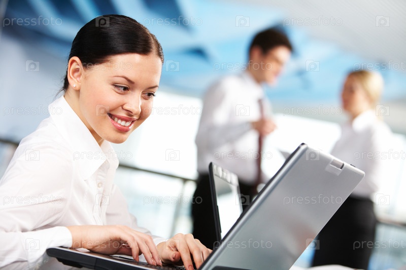Портрет женщины-руководителя, работающей с ноутбуком на фоне общающихся партнеров