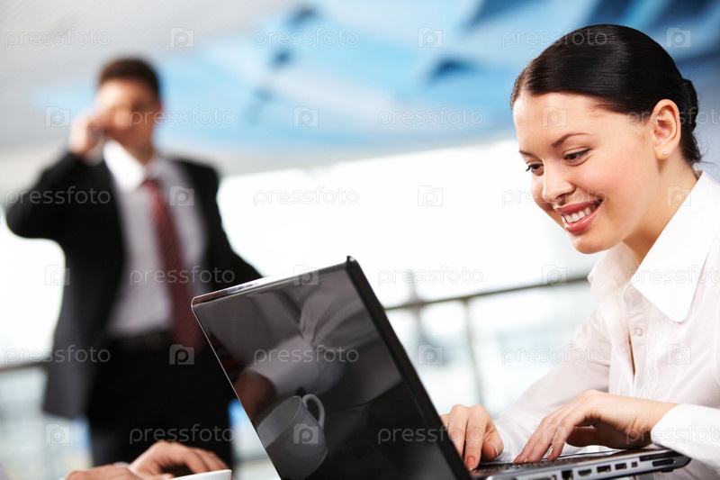 Портрет женщины-руководителя, работающей с ноутбуком на фоне общающихся партнеров