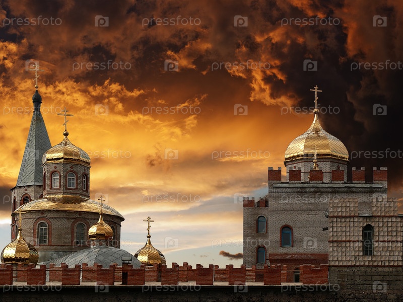 Золотистые купола храма на фоне заката