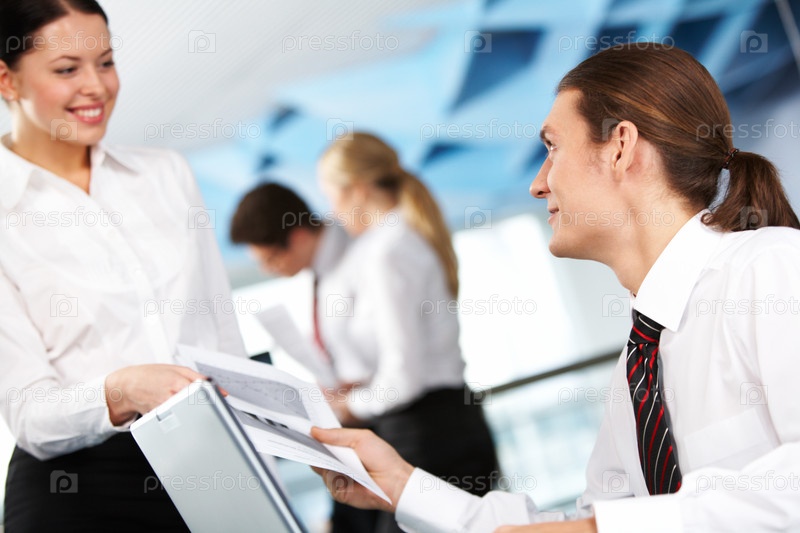Портрет занятого начальника, берущего документы из рук секретарши, глядя на нее