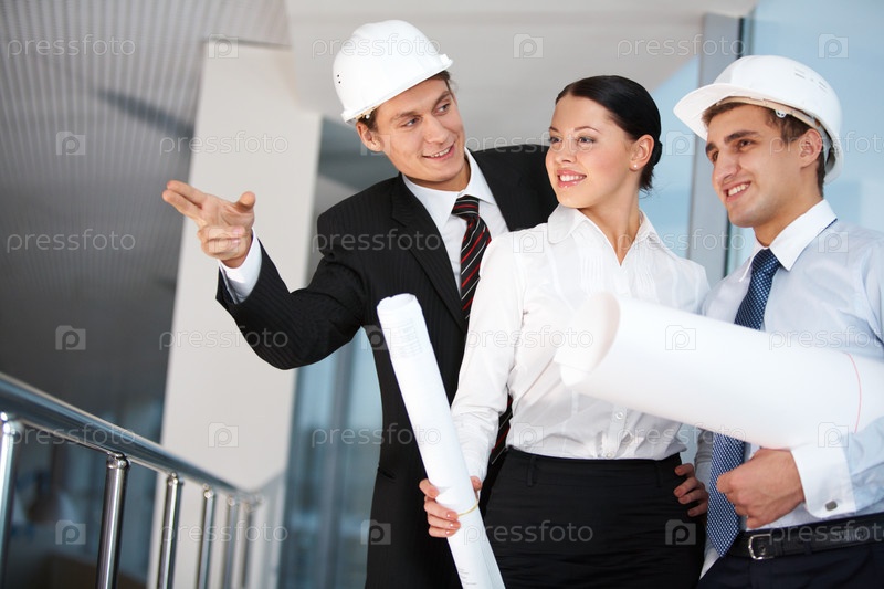 Изображение группы из трех рабочих, которые смотрят куда-то во время взаимодействия друг с другом