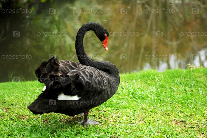 Черный лебедь на берегу пруда
