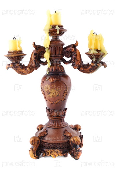 Деревянный резной подсвечник и три желтые свечи