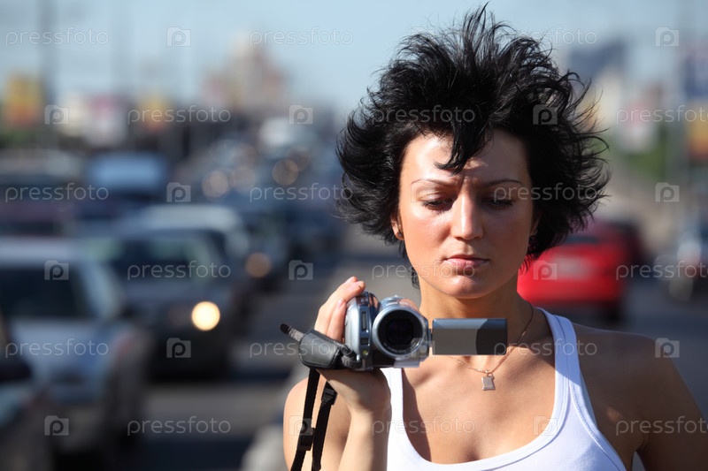 Портрет девушки с видеокамерой на трассе