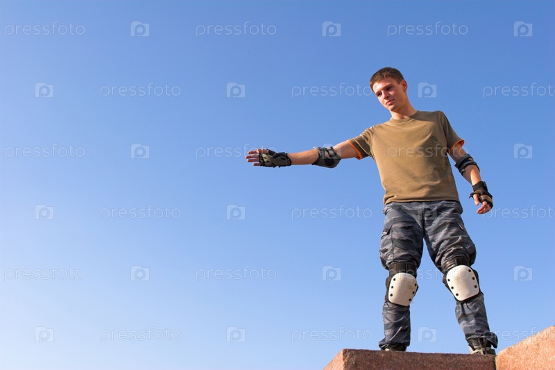 Активный роликовый мальчик прыгает с парапета на голубом небе