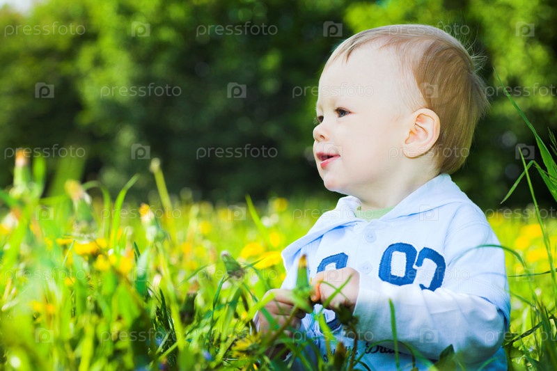 Малыш играет с одуванчиками в парке