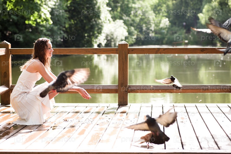 Улыбаясь сидеть с голубями в парке