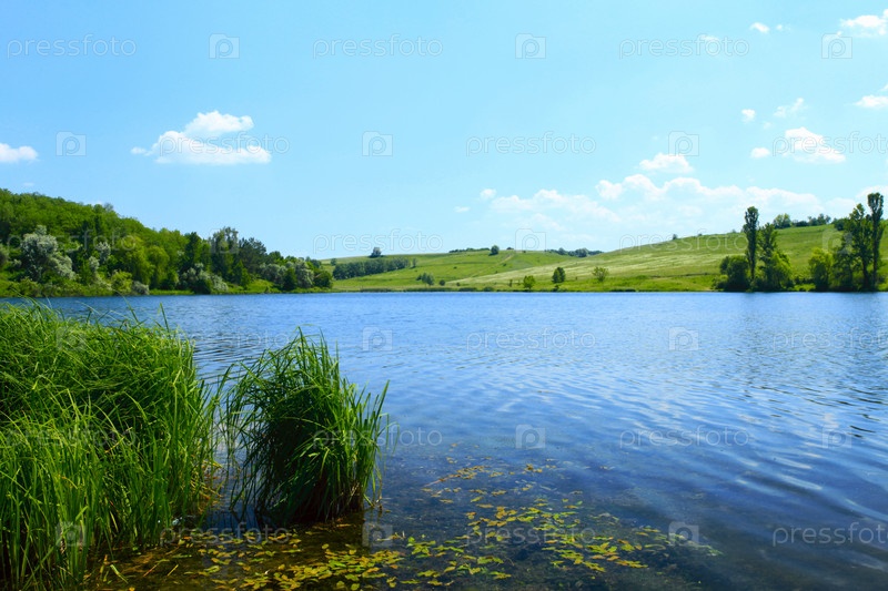 Лесное озеро летом под голубым небом