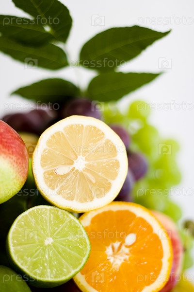 Лимон, лайм и апельсин на фоне фруктов