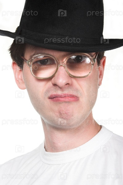 Сумасшедший мужчина в шляпе и очках с клаппером