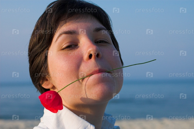 Девушка с трубой в губах возле моря