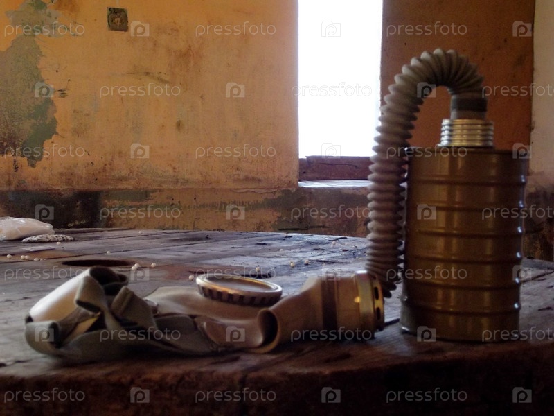 Противогаз с фильтром в заброшенном здании, в котором из окна льется белый свет