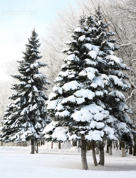 Рождественские ели с заснеженными ветвями в солнечном свете