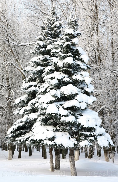 Красивые рождественские ели с заснеженными ветвями в солнечном свете