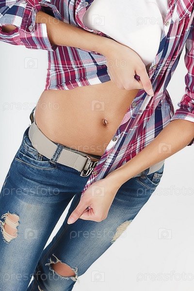 Привлекательные тело девушки в джинсах и клетчатой рубашке