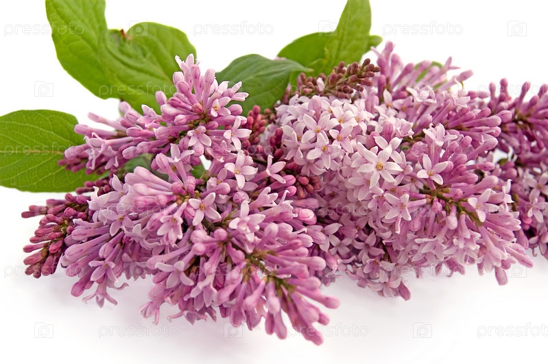 Бутон сирени с зелеными листьями на белом фоне