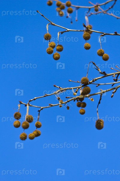 Крым в феврале. Коробочки семян платана на фоне синего неба
