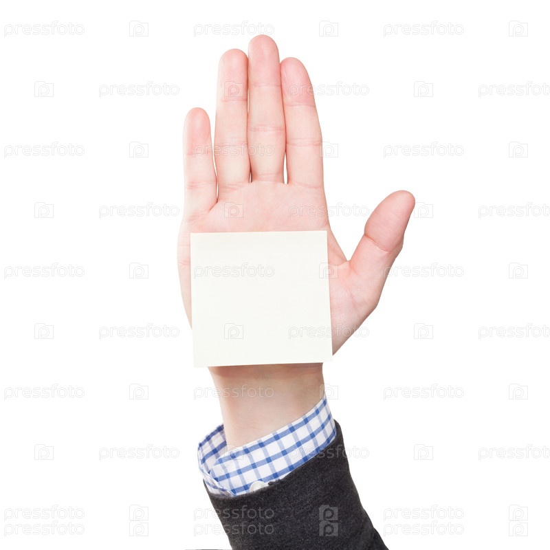 Пустой стикер приклеен к мужской руке, поднятой вверх