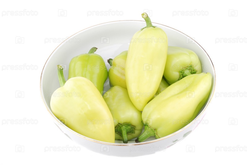 Зеленые перцы в тарелке на белом фоне