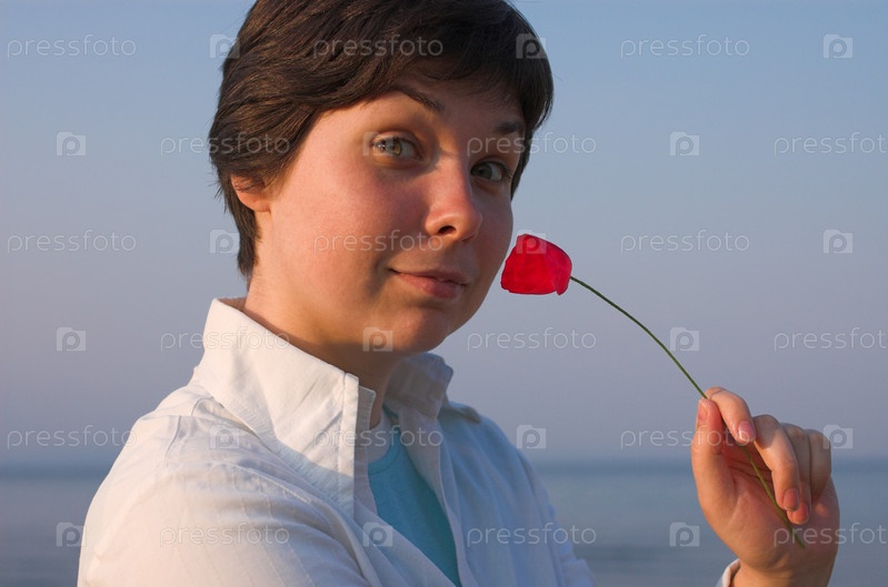 Девушка на поле маков и синего неба