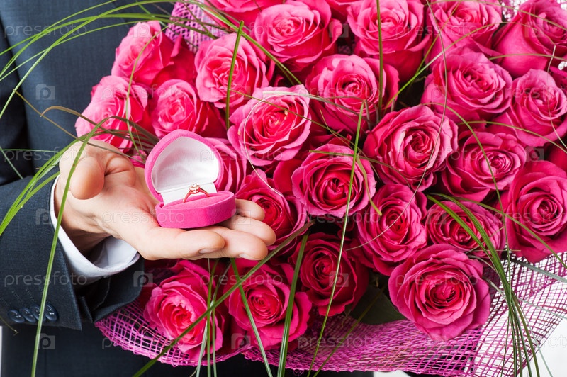 Цветы и кольцо в розовой коробке