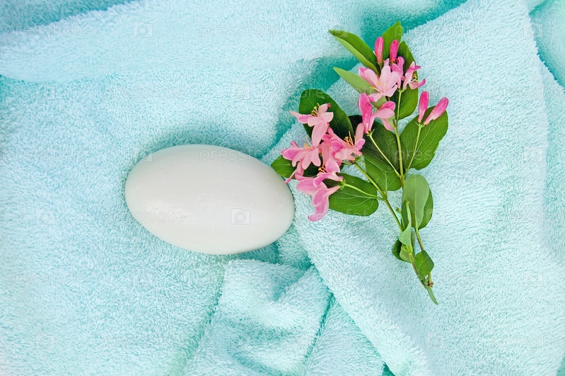 Белое мыло и цветущая розовыми цветами веточка на голубом полотенце