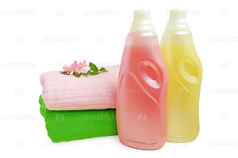 Веточка с розовыми цветами и зелеными листьями на полотенцах и две бутылки ополаскивателя