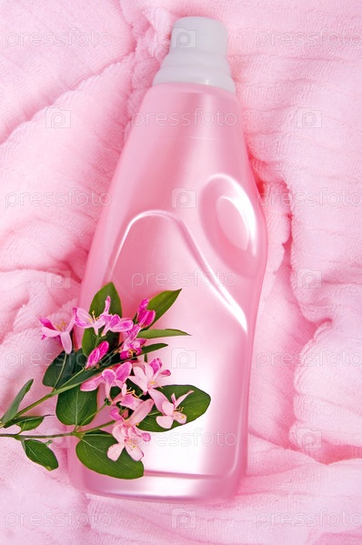 Веточка с розовыми цветами и бутылка ополаскивателя на полотенце