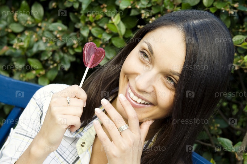Красивая улыбающаяся девушка с леденцом