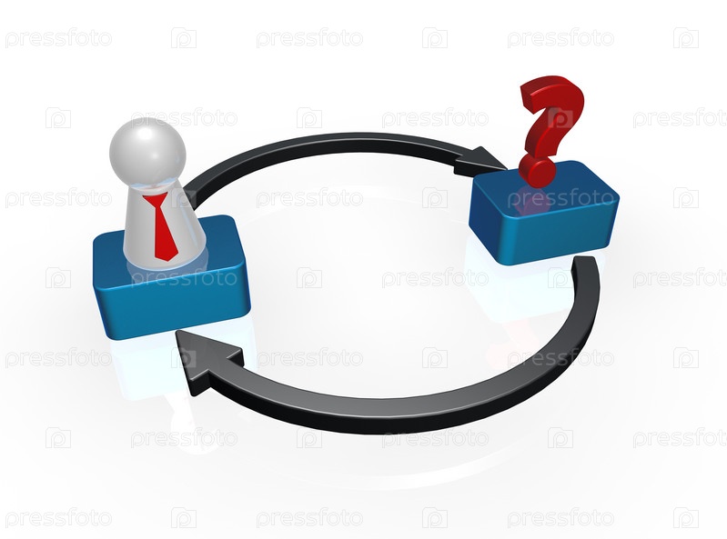 Вопросительный знак и фигура с галстуком на стрелках - 3d иллюстрация