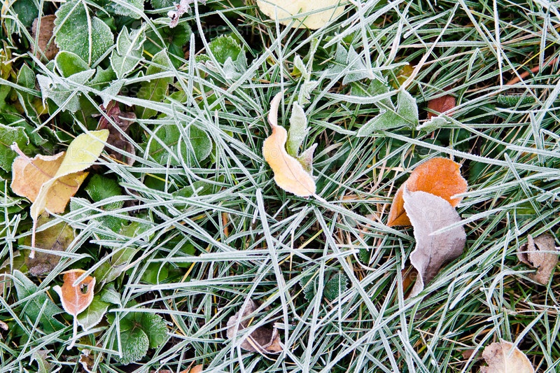 Трава и листья земляники, покрытые инеем