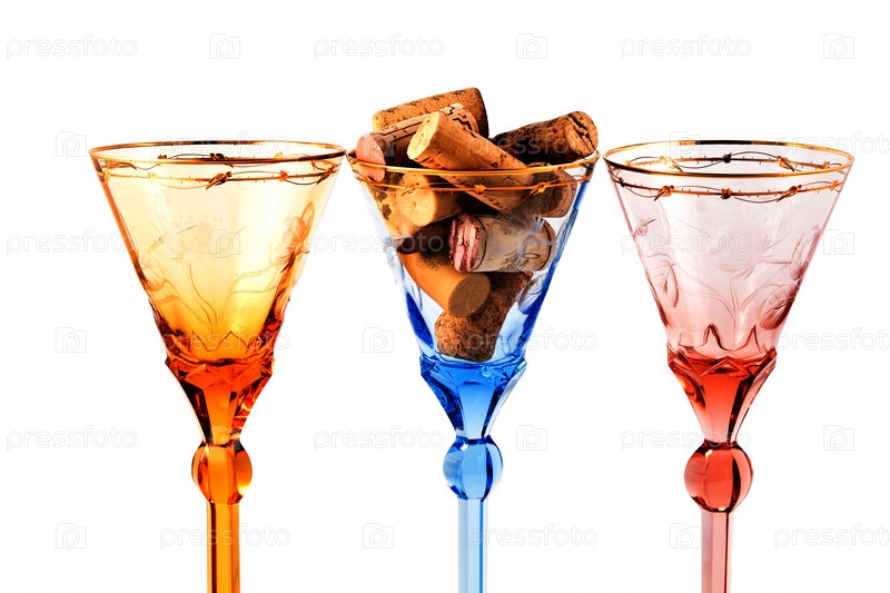 Три цветных фужера с винными пробками