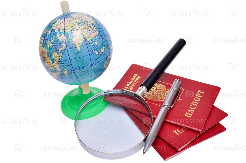 Три паспорта, глобус и увеличительное стекло на белом фоне